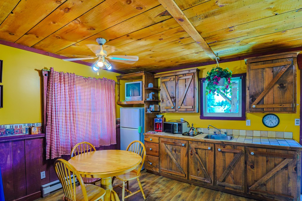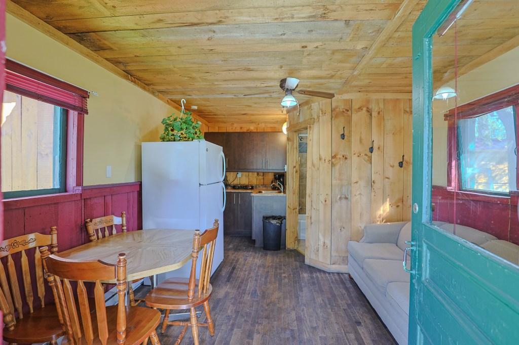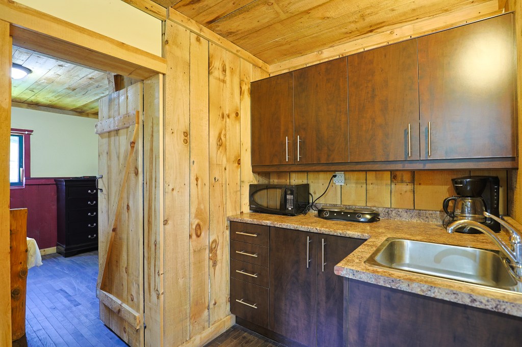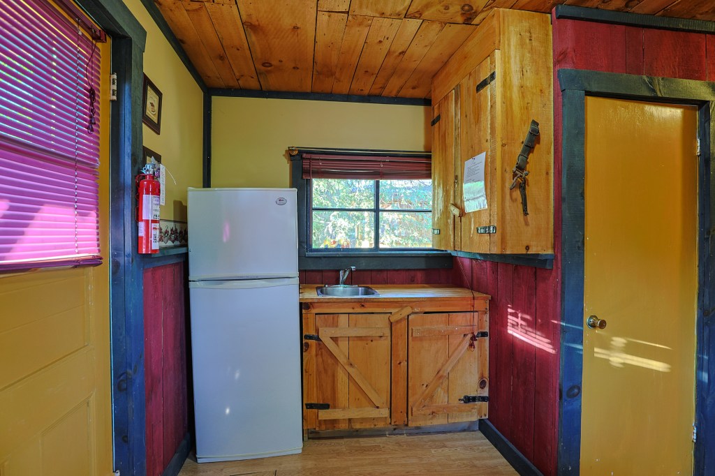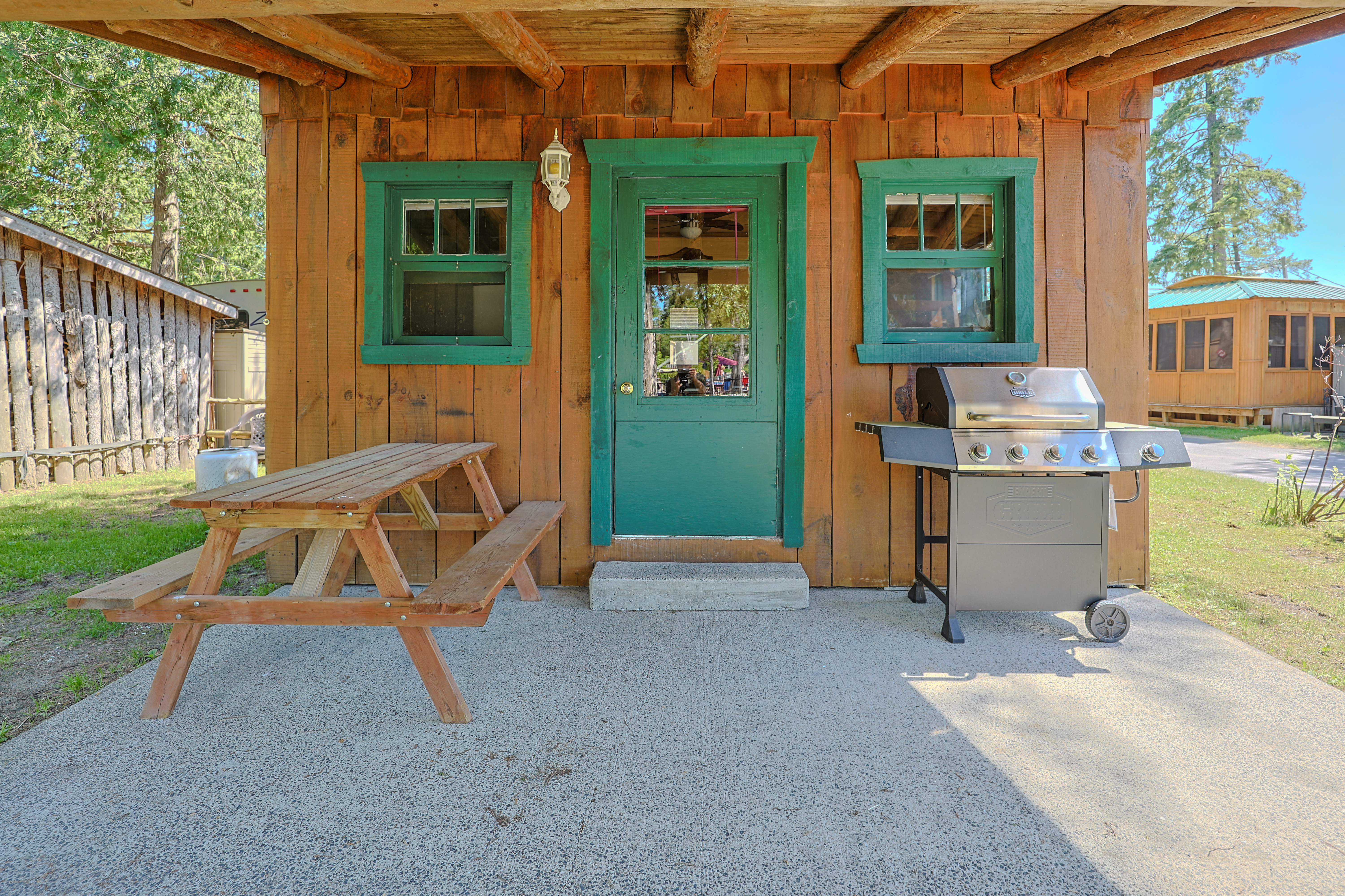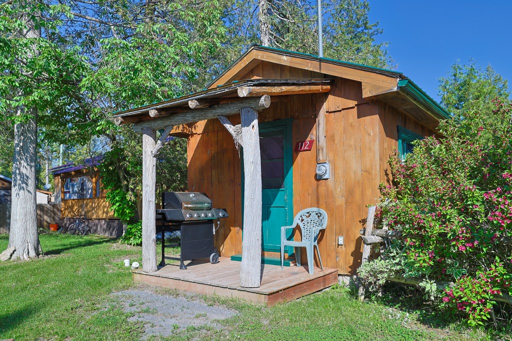 INCLUDED: Refrigerator, 2 round stove top, microwave, toaster, BBQ with propane. Dishes, glasses, cups, utensils, pots and pans, plastic containers, strainer, shredder, can opener, coffee machine (coffee not included) Broom, mop, cleaning products, garbage bags, 2 rolls of toilet paper, salt & pepper, alarm clock, television with video game adapter and DVD as well as picnic table and fire ring.