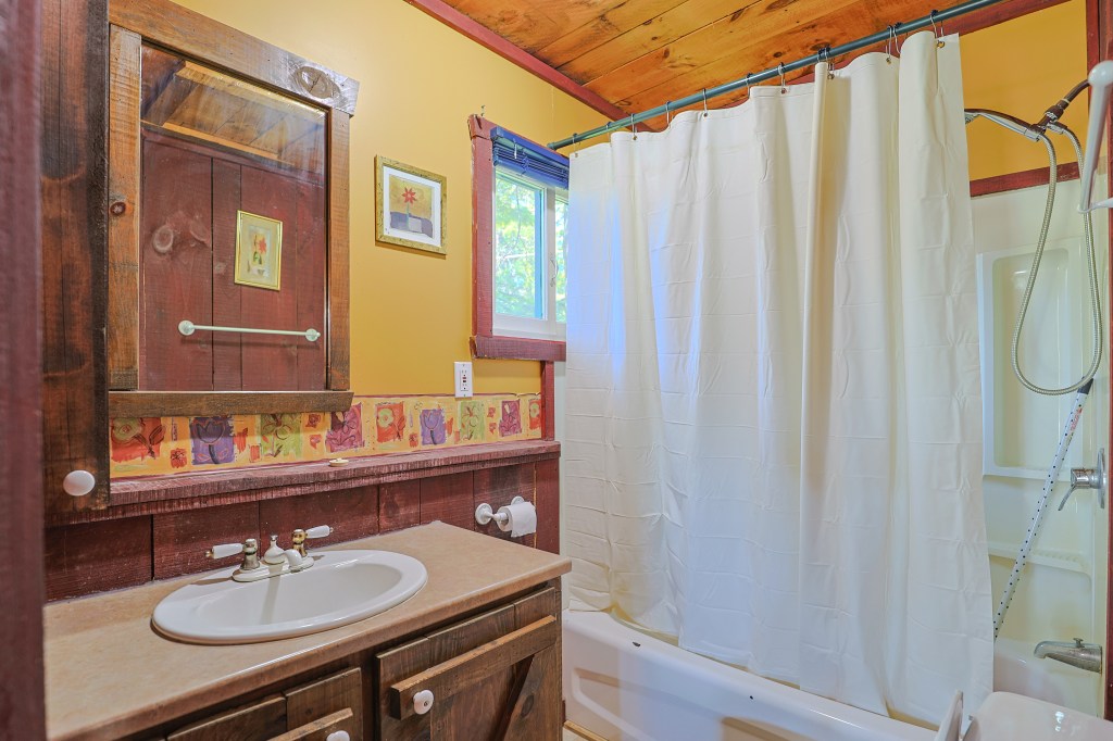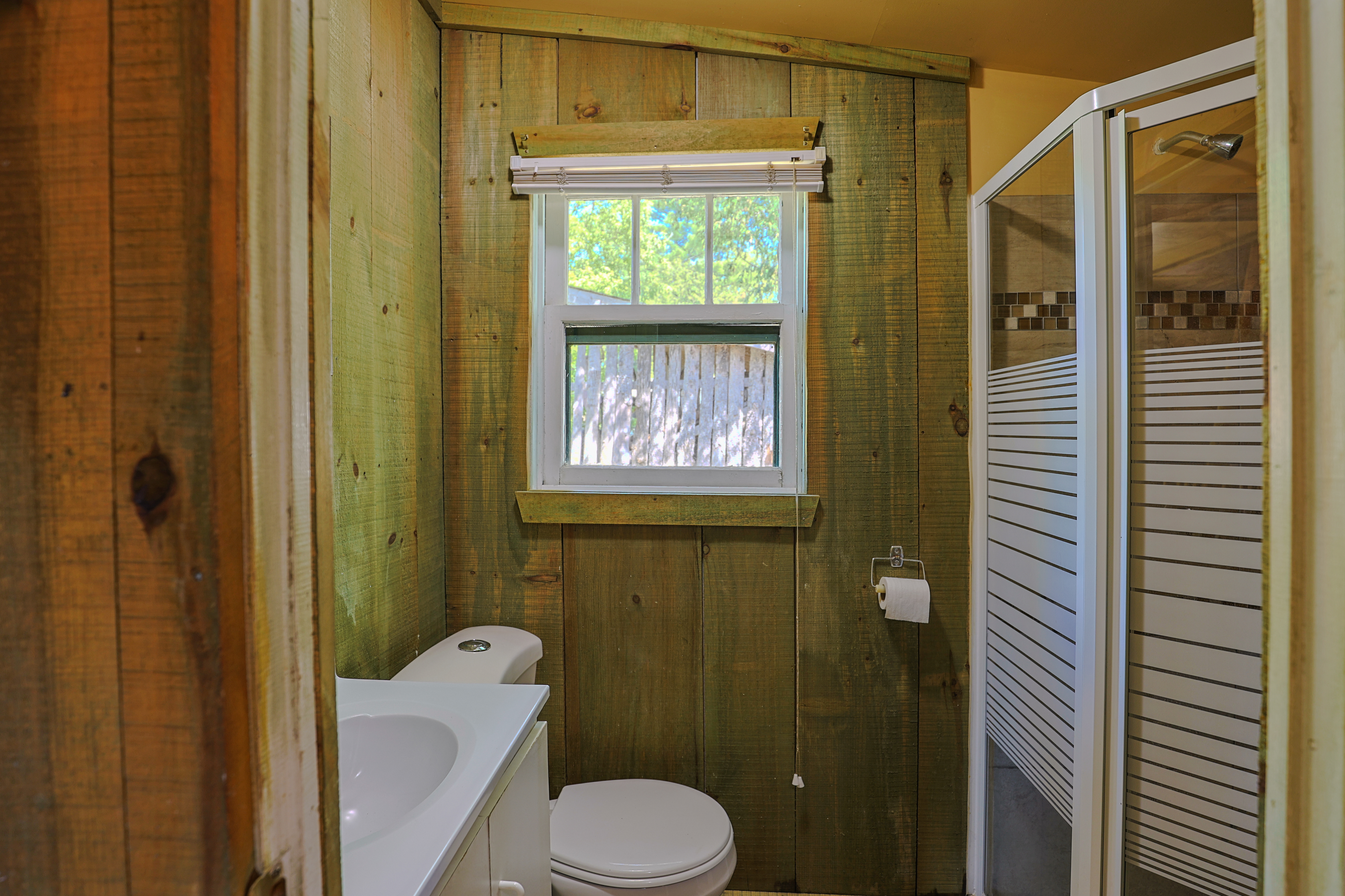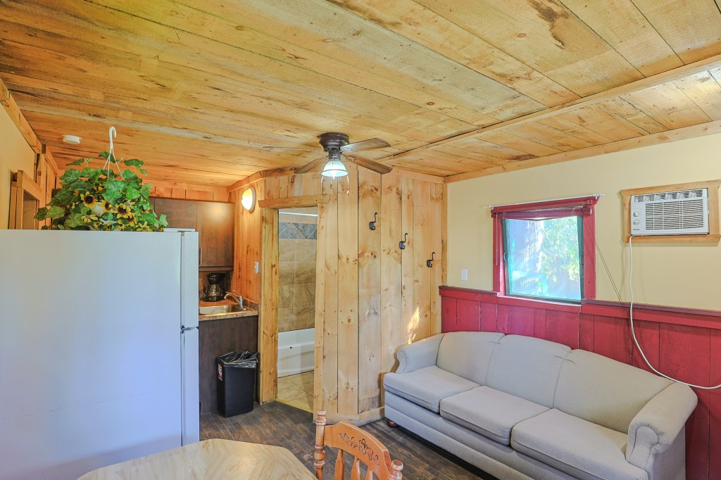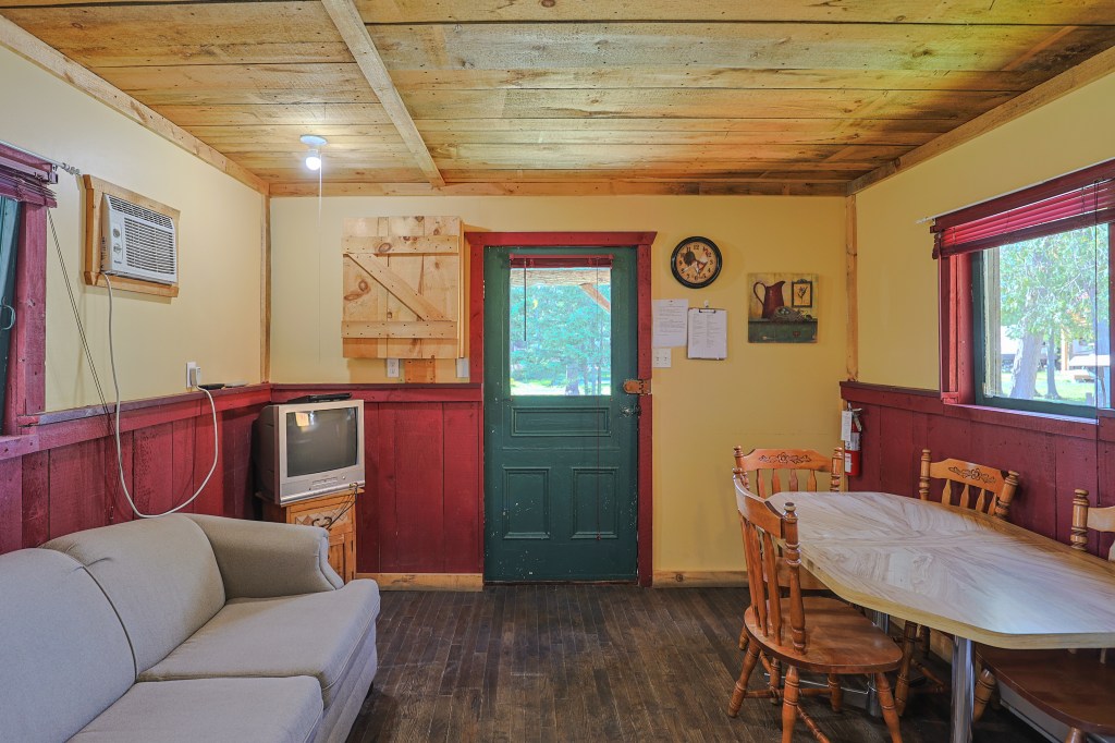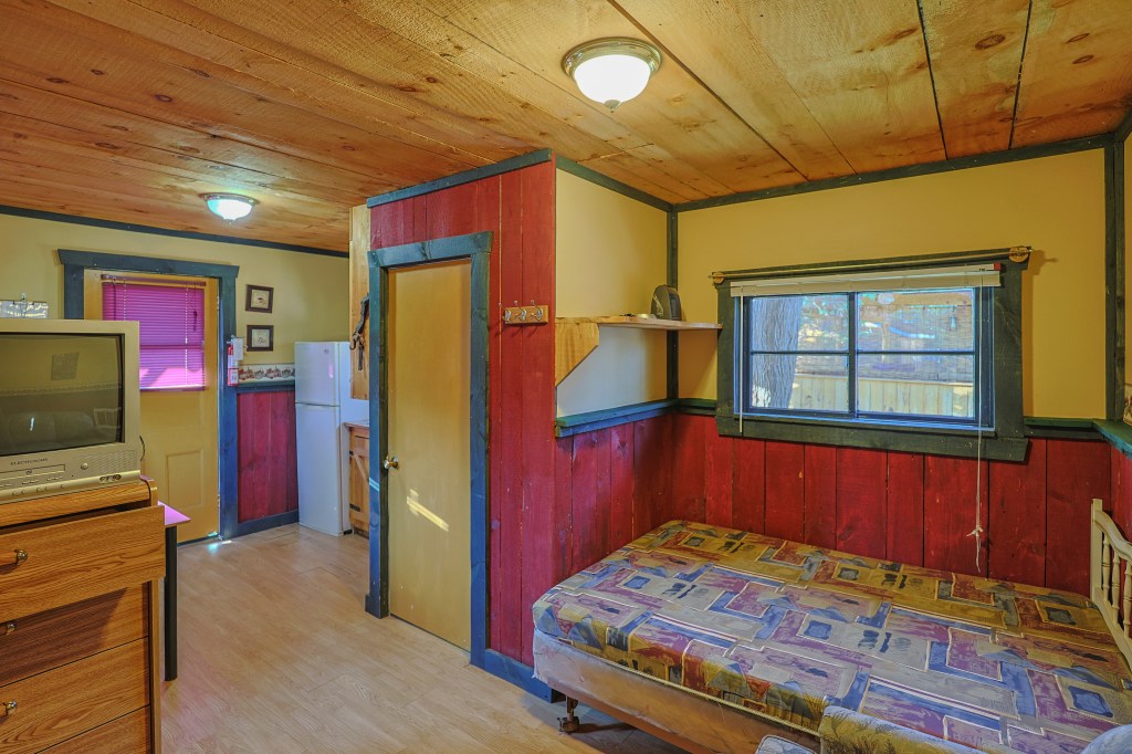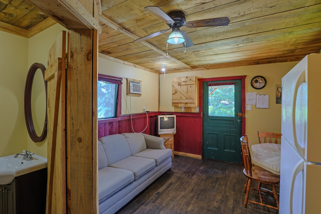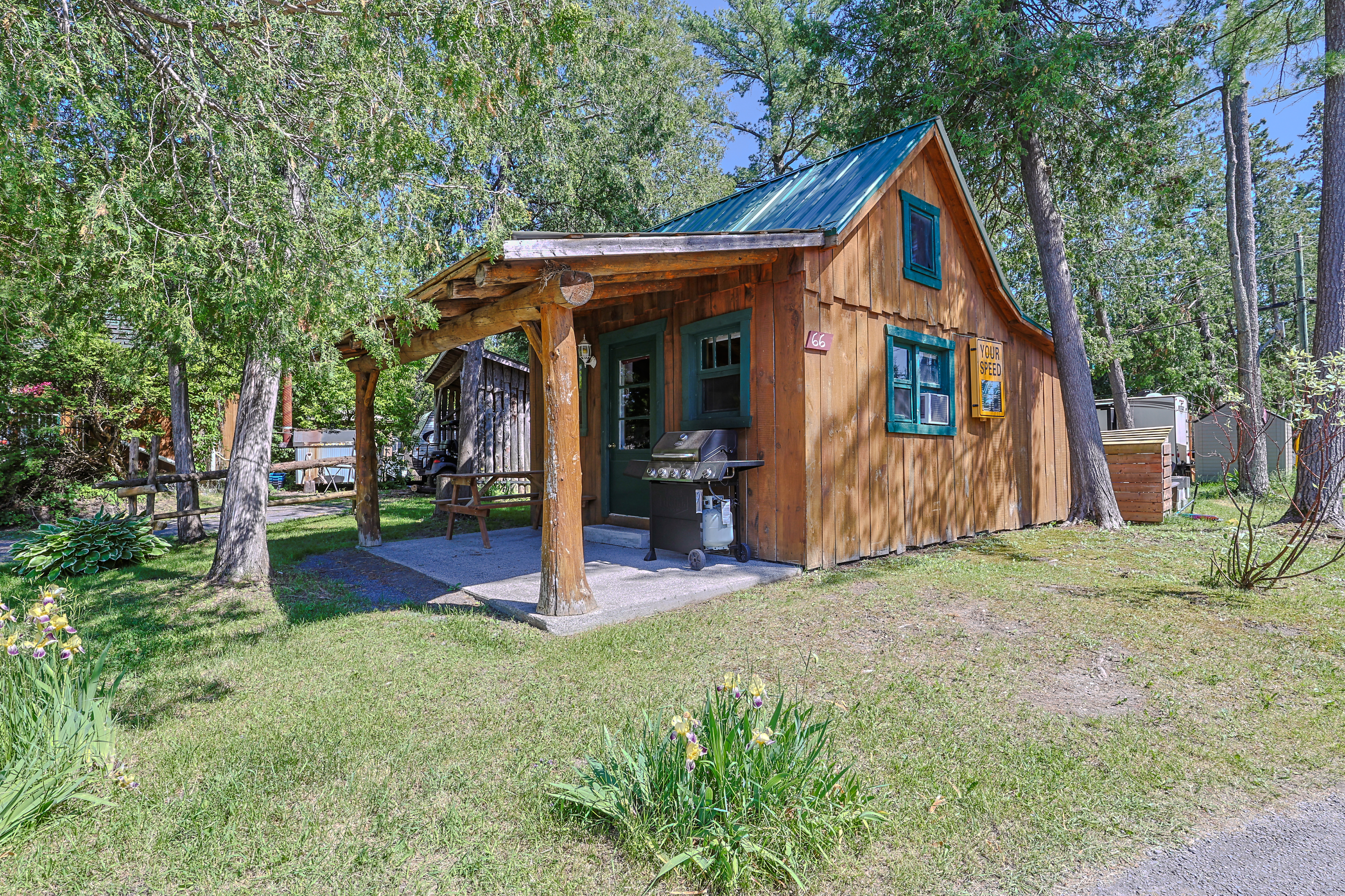 INCLUDED: Refrigerator, 2 round stove top, microwave, toaster, BBQ with propane. Dishes, glasses, cups, utensils, pots and pans, plastic containers, strainer, shredder, can opener, coffee machine (coffee not included) Broom, mop, cleaning products, garbage bags, 2 rolls of toilet paper, salt & pepper, alarm clock, television with video game adapter and DVD as well as picnic table and fire ring.